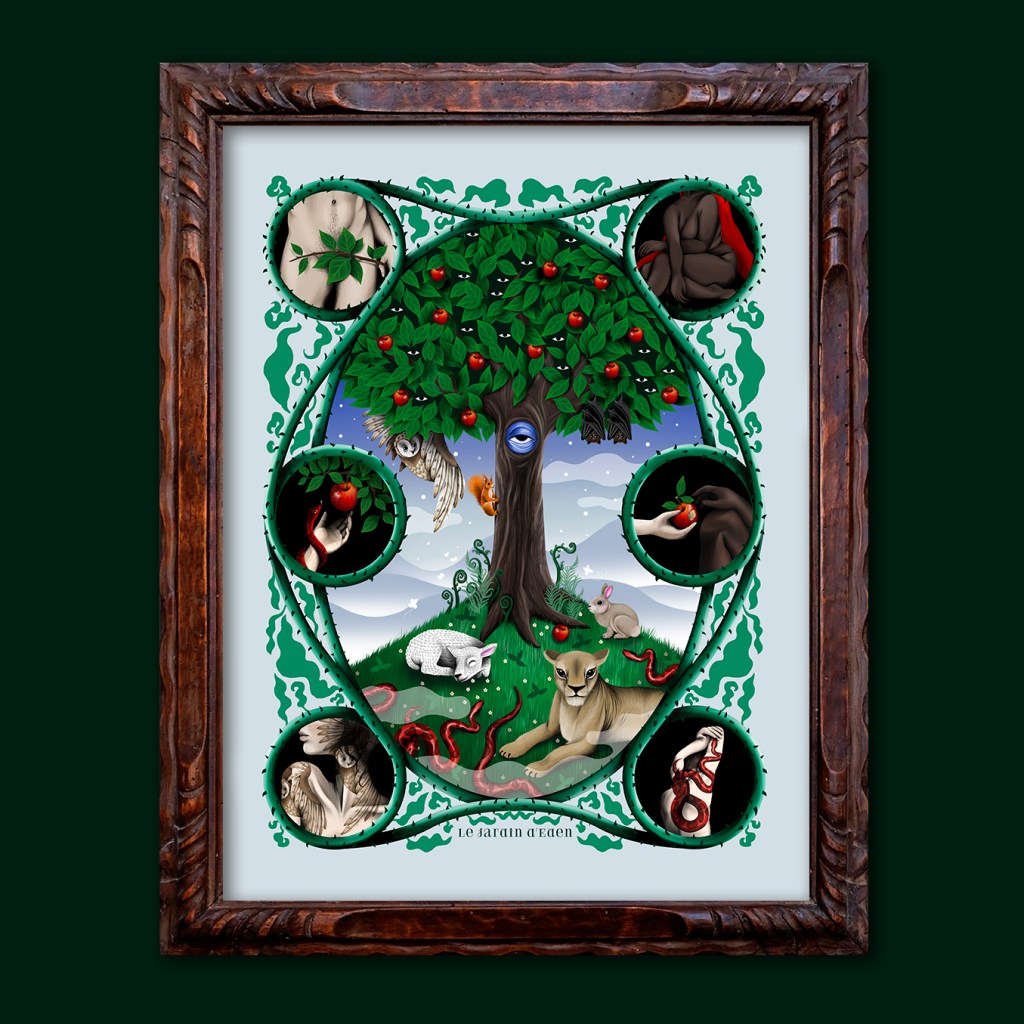 Sous le nom de « Chair Sacrée » Eva Alam réalise des objets de décoration et de papeterie issus de ses illustrations, dans un esprit cabinet de curiosités. Ses sujets de prédilection sont la nature, le mystique et l’étrange. Organisées en collections thématiques, les illustrations sont réalisées en technique de peinture digitale et imprimées sur papier photo.