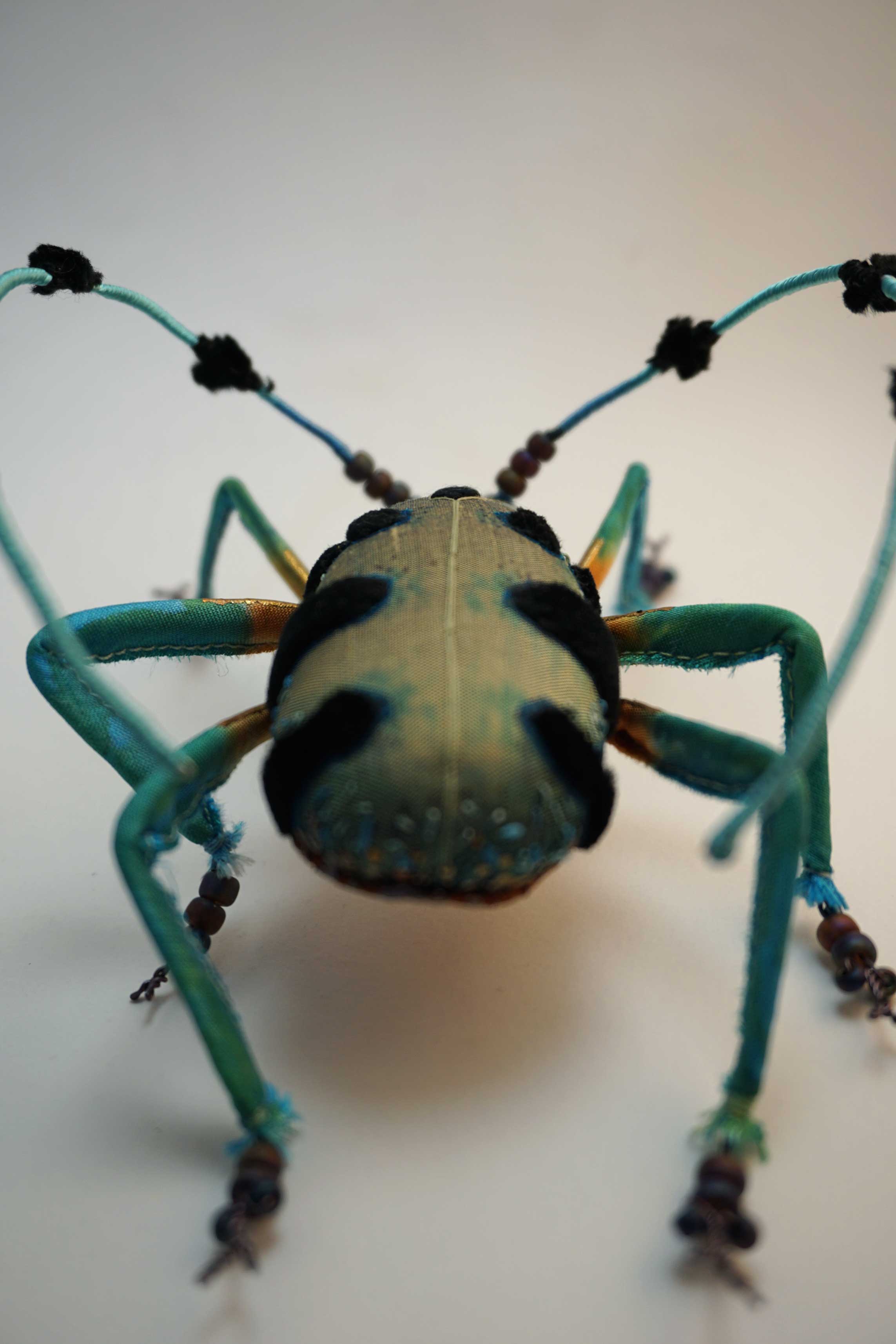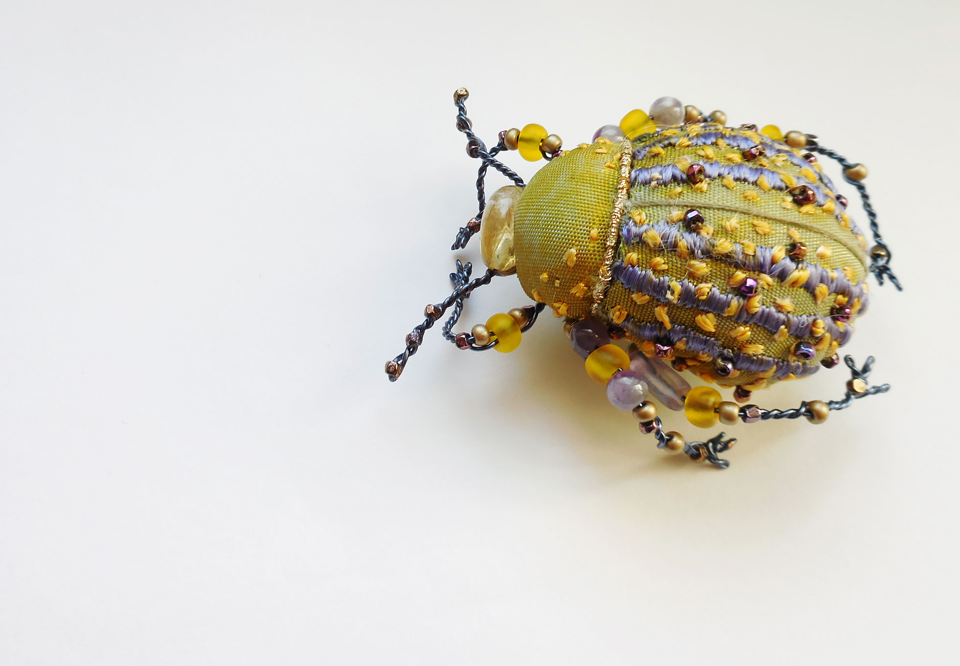 Ce travail est un moyen d’interroger la matière textile en l’utilisant comme médium pictural. J’aime l’idée de faire disparaître la matière au profit du sujet, et ainsi interroger le public en rendant flou les frontières entre le réel et sa représentation. Lorsque je crée des bijoux, mon travail est plus fantaisiste, Je choisi un tissu qui m’inspire, des perles, des paillettes… J’évoque alors l’insecte plus que je ne le copie. J’utilise des tissus précieux que je récupère, des fils de soie, des perles anciennes, des pierres semi précieuses…